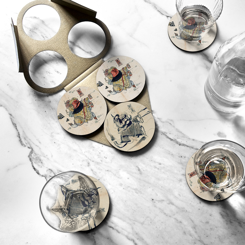 BAM ! Pour une décoration personnalisée ou un cadeau original, voici trois oeuvres exclusives de Fan Yuqin, imprimées sur 6 sous-verre en bois stratifié sur du liège.